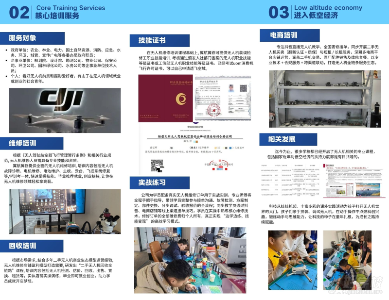 我们是一家集无人机应用技术,维修,培训,回收,租赁,销售实体门店,配件供应"全渠道于一体的专业化的无人机维修培训机构,位于重庆大学城附近。我们将培养每一位学员都能成为所在区域的优秀菁英,缔造创富梦想。现拥有一支奋力进取创新,高效精干的师资团队。