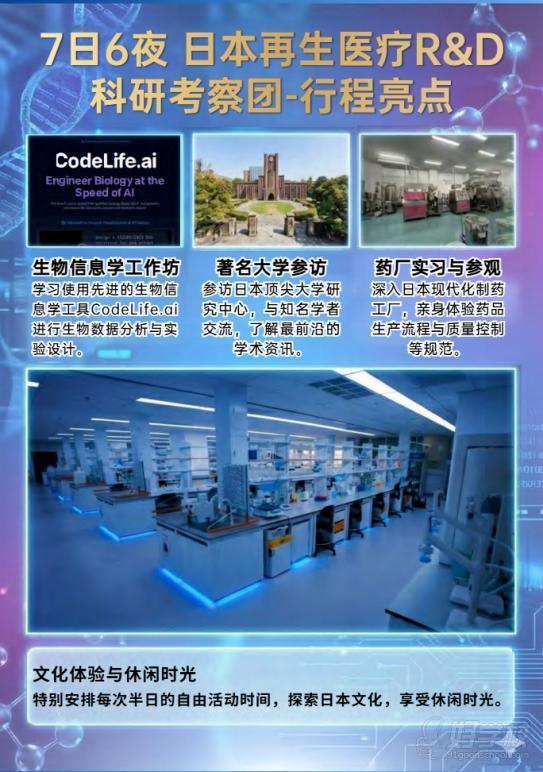 世界名校+日本产业双通道深度体验:参访世界大学,与国际学者交流,了解最前沿的学术资讯和海外文化。走进日本制药/生物科技工厂,亲身体验学习从研发一生产一质量控制的完整链条。