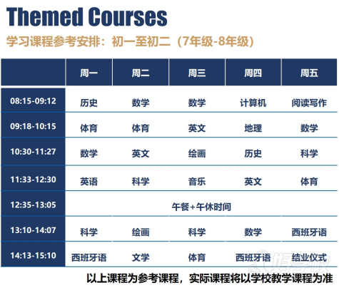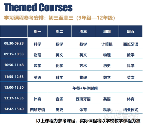 美国学校实行走班制,即必修课+选修课,所以同班同学的课表都不相同,中国学生会根据所匹配美国伙伴的课表,跟随美国伙伴进行校园课程学习。在此,我们提供给家长一份参考课表: