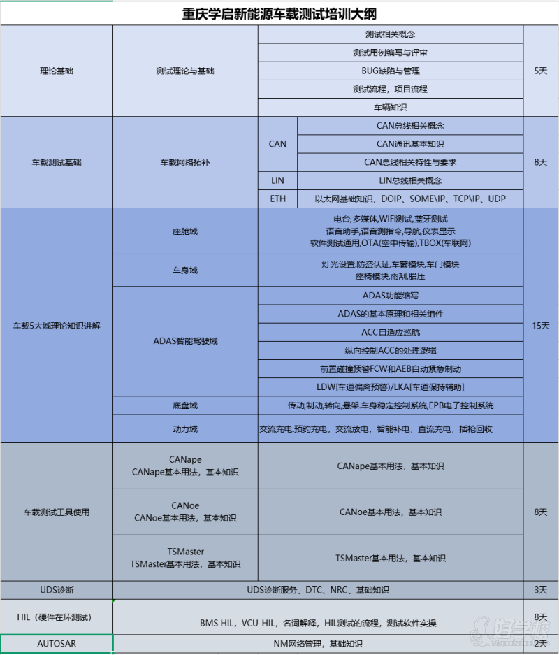 阶段划分:理论基础(5 天)→车载网络(8 天)→域控制器测试(15 天)→工具应用(8 天)→诊断与高级测试(13 天)