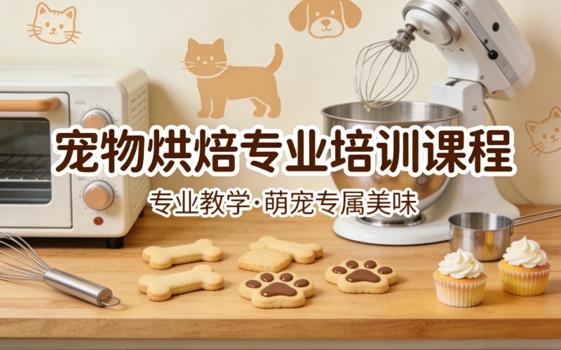学习宠物营养专业知识与烘焙技巧,以人的食品为标准,全面符合宠物营养需求的健康宠物食品,将科学喂养宠物观念和方法的传授实操课程。包括:宠物营养学理论,常见食材属性及犬猫食用禁忌,宠物烘焙食品常见配比计算方法,多种宠物烘焙零食制作方法(肉干,鸭片等),猫咪狗狗专用蛋糕设计造型与制作,营养鲜粮膳食制作,宠物甜品蛋糕制作(布丁、甜甜圈、宠物月饼、冰淇淋),宠物烘焙摆台设计。