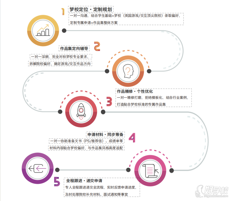 本项目为一站式留学服务,全程覆盖留学申请全流程,服务周期从学生大三启动至成功入学英国名校结束。 2-9 月完成梦校定位与专属申请、作品集方案定制;10-2 月递交申请并跟进 offer 获取;大四 2-7 月准备语言并换取无条件 offer,7-8 月协助签证办理直至入学。服务内容包含一对一梦校规划、作品集定向辅导与个性精修、文书 / 成绩单等申请材料筹备、申请全程递交跟进,还可免费申请 50 + 英国合作住宿平台。核心学习优势为拒绝模板化与流水线教学,导师从项目构思到定稿全程深度跟进,一对一精修作品集,且每位导师最多带 5 位学生,确保教学专注度。