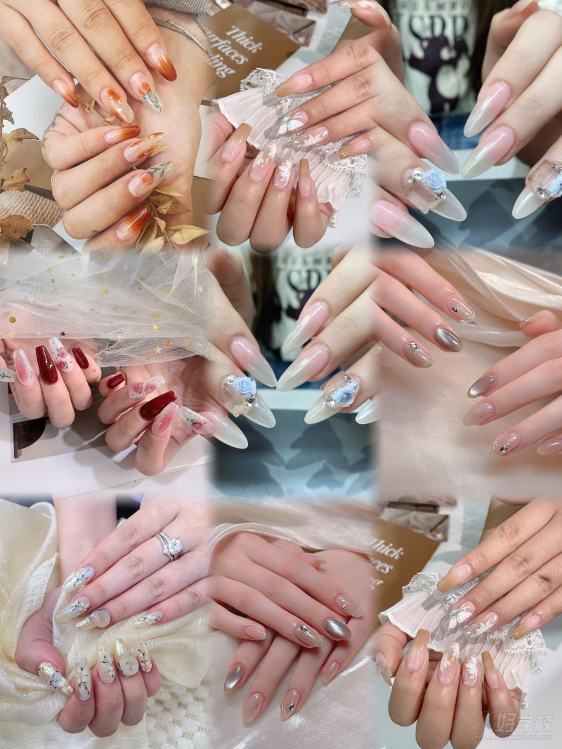 本课程作为美甲专业全科培训,内容涵盖美甲行业核心技能,兼顾基础入门与进阶提升,确保学员能够全面掌握美甲实操技巧与理论知识。具体包括:甲片制作与精细化处理,从甲片的选择、修剪、粘贴到后期调整,全程实操教学,帮助学员掌握不同甲型的甲片适配技巧;专业卸除甲片技巧,教授安全、温和且不损伤本甲的卸除方法,规避卸甲过程中常见误区;光疗胶全面认知,详解各类光疗胶的特性、适用场景及储存方法,教会学员根据不同需求选择合适的光疗胶;延长甲规范操作,涵盖自然延长、法式延长等多种延长方式,重点训练延长甲的塑形、固化及修型技巧,确保延长甲牢固、美观且贴合本甲;多元化款式制作,包括基础纯色涂抹、渐变、晕染、钻饰镶嵌、手绘图案等热门款式,从基础款式到复杂创意款式逐步教学,培养学员的审美与创作能力;打磨机的正确使用与维护,讲解打磨机的操作规范、不同磨头的用途,以及日常保养技巧,帮助学员提升操作效率,延长工具使用寿命,同时规避操作安全隐患。