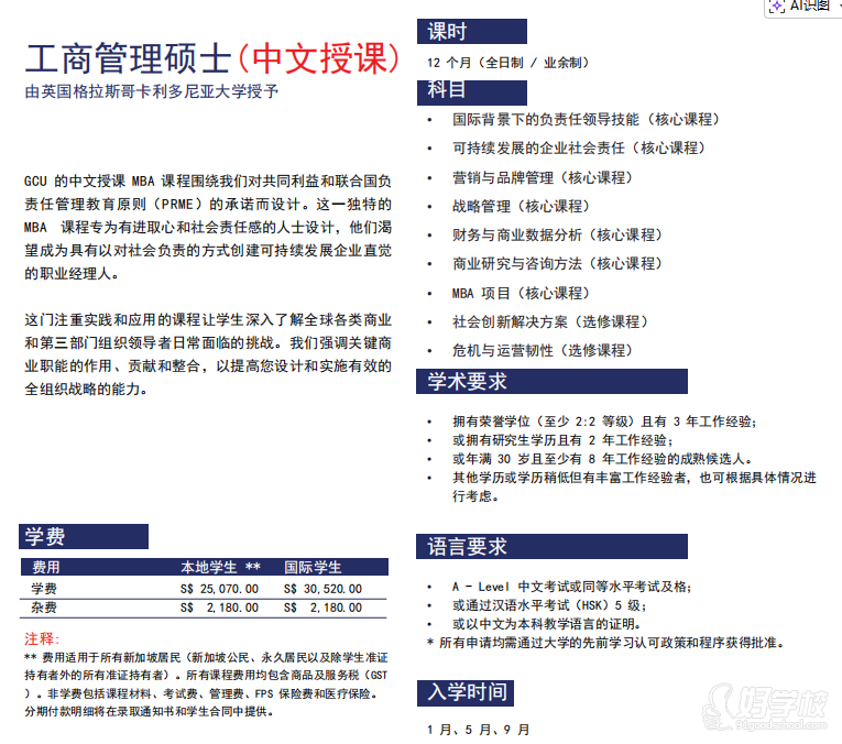 本课程由英国格拉斯哥卡利多尼亚大学授予学位,新加坡育德国际学院(EGA)负责授课,分中文授课和英文授课两个版本,均为 12 个月全日制 / 业余制培养模式,一年设 1 月、5 月、9 月三次入学机会。课程依托格拉斯哥卡利多尼亚大学的优质学术资源与育德国际学院的实践教学特色,围绕联合国负责任管理教育原则设计,是融合全球商业视野与实践应用的工商管理硕士课程,所有费用均包含新加坡商品及服务税,且提供分期付款方案。