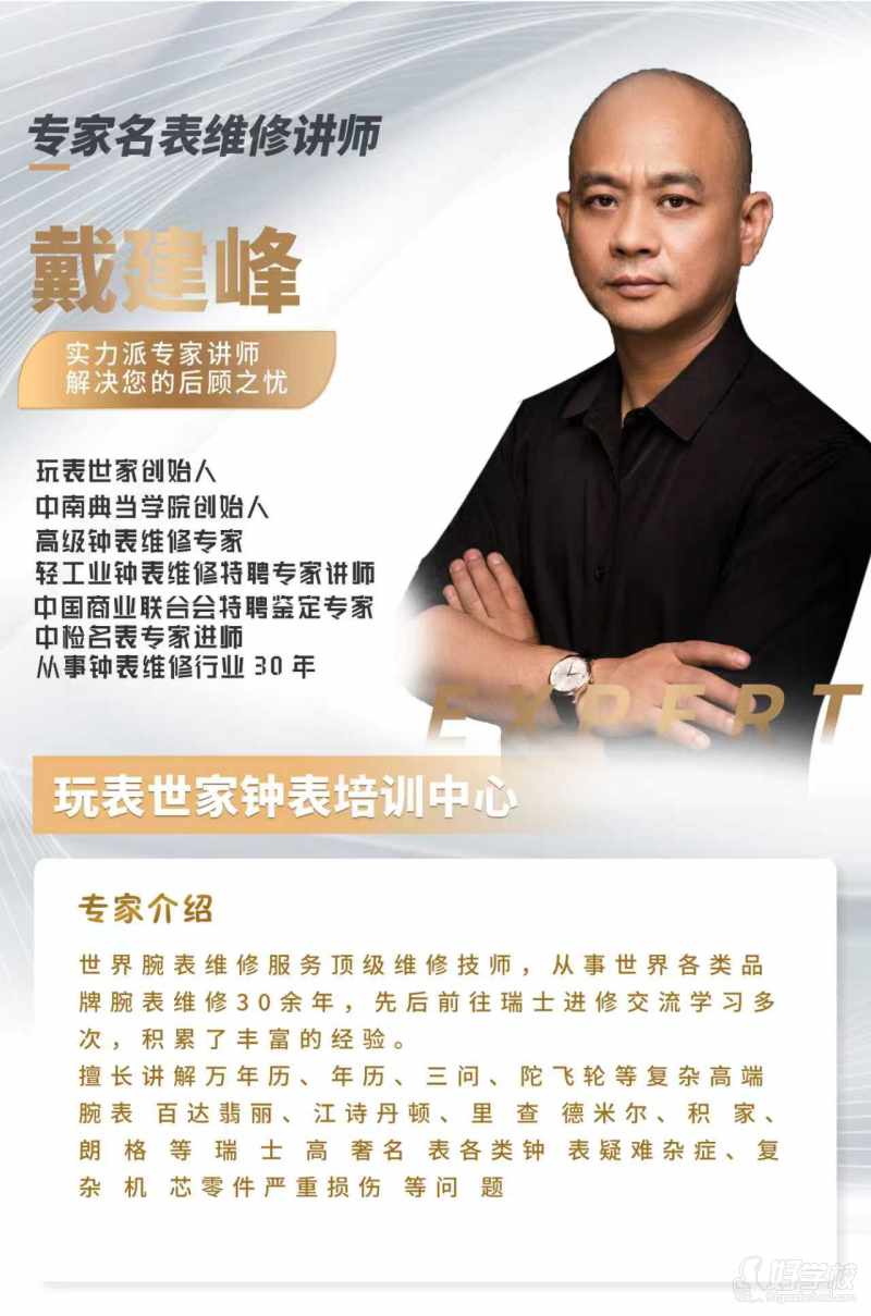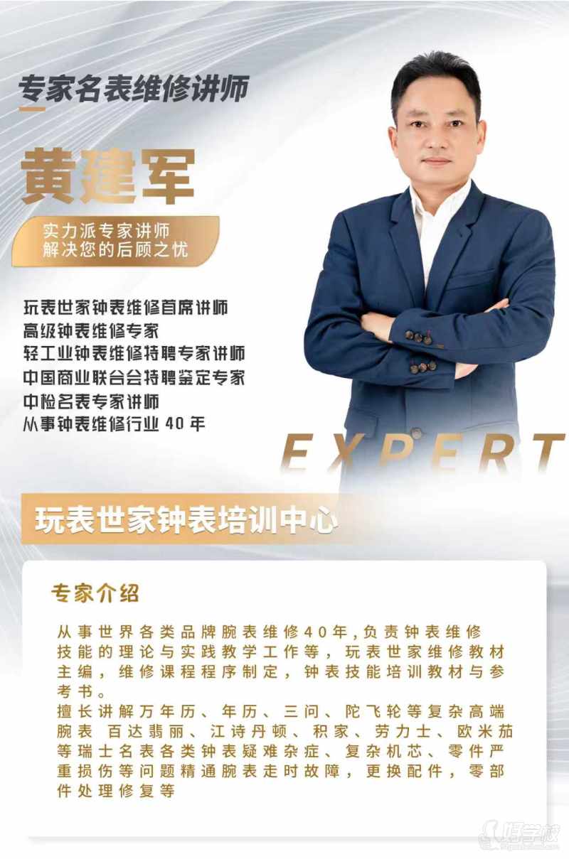 从事世界各类品牌腕表维修 40 年,负责钟表维修技能的理论与实践教学工作等,玩表世家维修教材主编,维修课程程序制定,钟表技能培训教材与参考书。