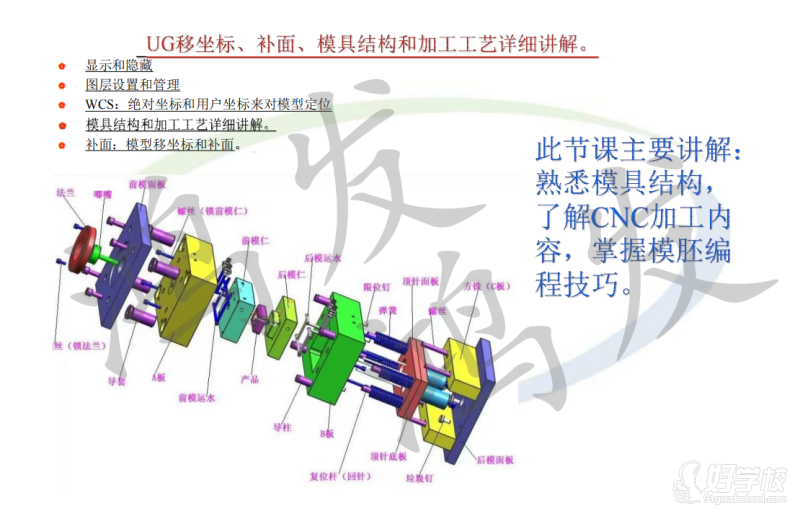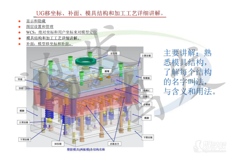 主要讲解:熟悉模具结构,了解每个结构的名字叫法与含义和用法。