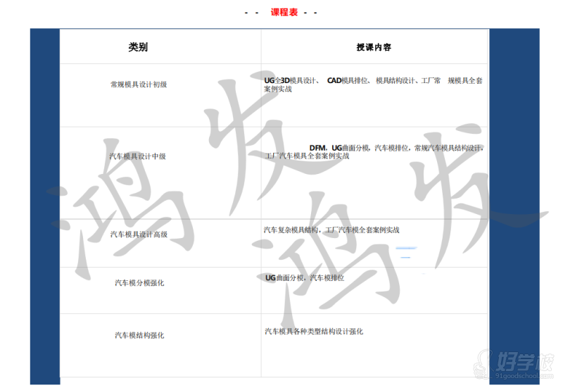 鸿发于2014年开设教育培训事业部,永久致力于“培养大国工匠,助力中国制造”,为企业、技术院校及个人,提供优质、专业的产品研发、技术培训、技术支援等服务。下设规划部、培训中心、就业部、后勤管理部等四大服务部门。专注于模具编程及产品零件编程培训,走精品路线,让学员踏踏实实学好技术,真正实现“技术改变命运”。我们在东莞拥有自已的加工厂,加工范围涉及到模具加工、产品加工、零件加工,拥有CNC硬轨机三台,四台线轨机加工产品零件,小型模房,五台注塑机。迄今已为加工行业输送上千名的模具和产品零件编程优秀人才,是目前同行业中竞争力的大型专业编程培训机构之一。
