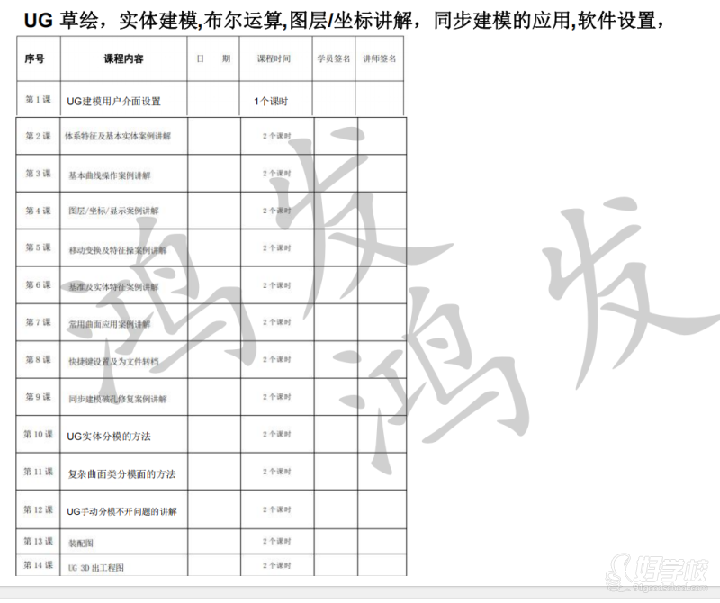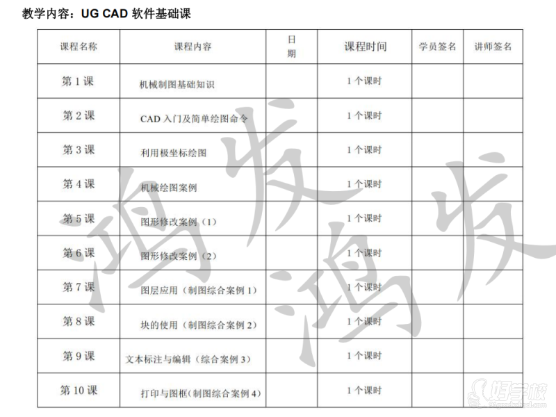 3.毕业生能熟悉工厂设计程序,达到工厂2-3年模具设计经验教学内容:UGCAD软件基础课(15天左右)