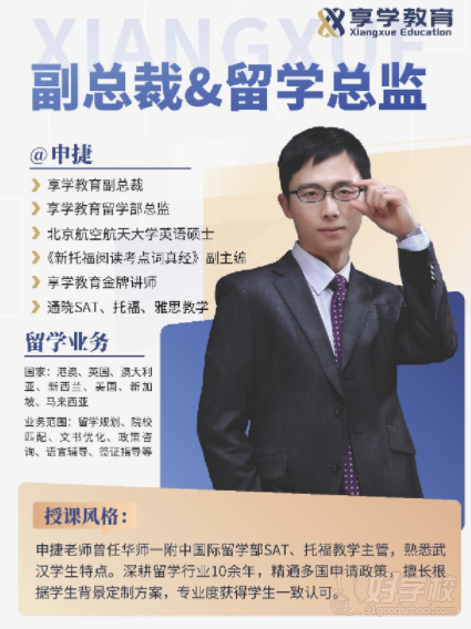 享学教育副总裁、享学教育留学部总监、北京航空航天大学英语硕士、《新托福阅读考点词真经》副主编、享学教育资深讲师、通晓 SAT、托福、雅思教学