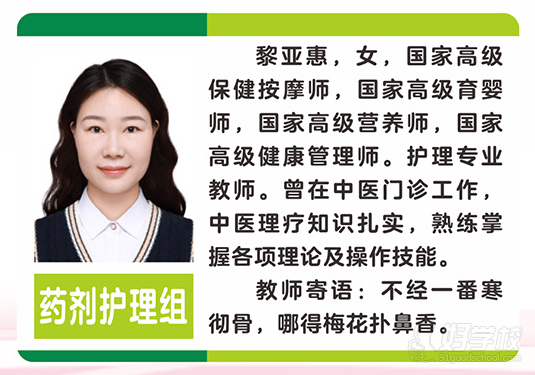 女,国家高级保健按摩师,国家高级育婴师,国家高级营养师,国家高级健康管理师。护理专业教师。曾在中医门诊工作,中医理疗知识扎实,熟练掌握各项理论及操作技能。