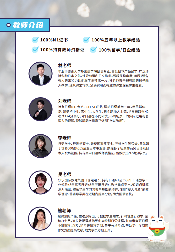 考勤+作业完成情况达标的学生,如果JLPT没考过,0-N2任选一阶段免费重读。彻底消除后顾之忧,我们与你并肩,直至成功取证。