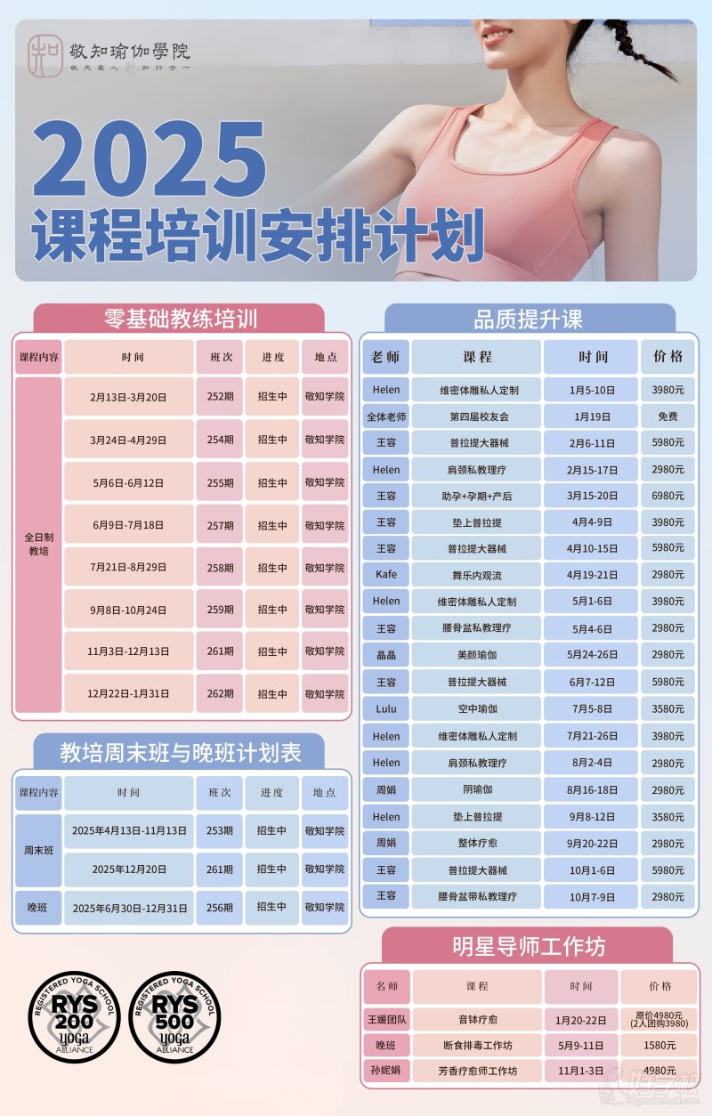 2025敬知瑜伽课程计划新鲜出炉,不管你是想零基础入行当教练,还是想进阶提升、跟明星导师学特色课,全年排期都安排明白啦!品质提升课涵盖维密体雕、普拉提、孕产等热门方向~