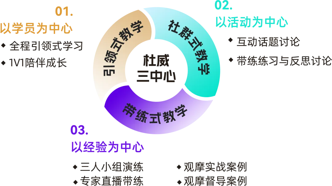 三位一体全新教学模式:以教育家杜威三中心理论为基础,研发出适合学员全面发展且学习效果的全新教学模式,跟踪学习体验