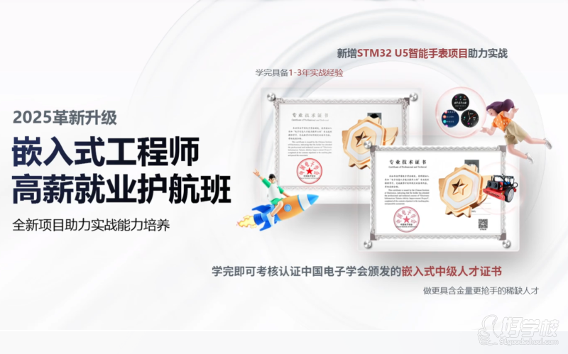 嵌入式系统设计工程师中级认证证书,是ST(意法半导体)、中国电子学会(工信部下直属事业单位)等权威机构合作推出高含金量的专业技术证书,华清远见提供考证平台和考证案例的设计及考前培训服务,中国电子学会颁发证书。完成华清远见非凡就业班高质量课程学习后,可选择参与测评,合格后可颁发《嵌入式系统设计工程师-中级(裸机编程)》认证证书和《嵌入式系统设计工程师-中级(Linux)》认证证书。