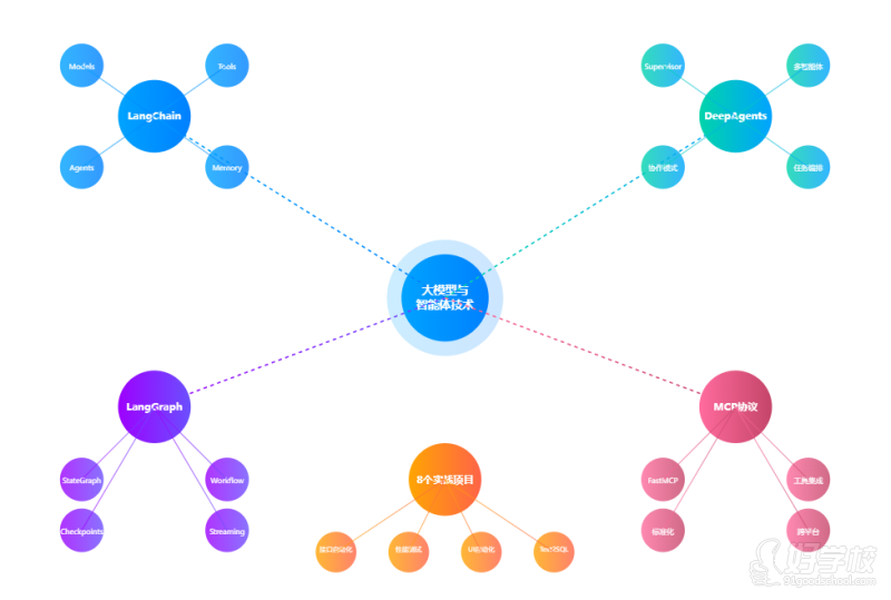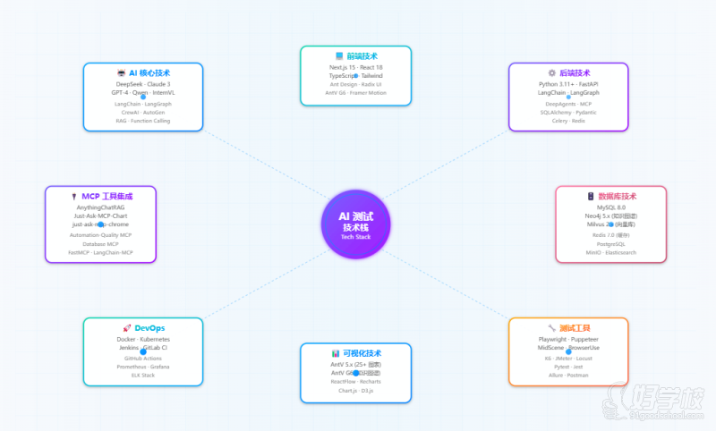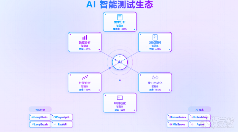 全面掌握智能体开发的核心技术栈,深入理解LangChain、LangGraph、DeepAgents等主流框架,掌握MCP协议、RAG技术、Function Calling等关键能力,通过8个企业级实战项目(接口自动化、性能测试、UI自动化、测试用例、需求分析、缺陷分析、Text2SQL、综合平台实战)构建完整的智能体开发技能体系。