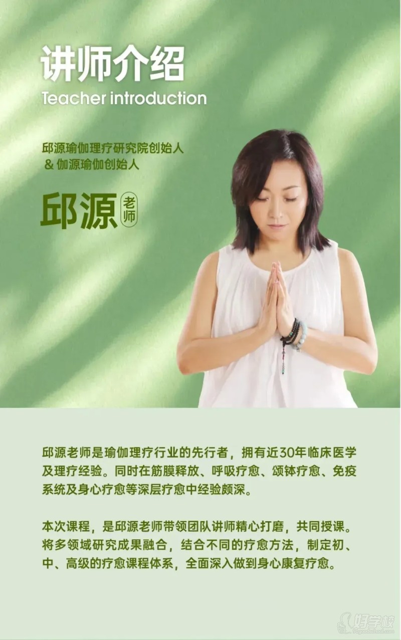 邱源老师:瑜伽理疗行业先行者,拥有近 30 年临床及理疗经验,精通筋膜释放、呼吸疗愈、颂钵疗愈等深层疗愈领域,亲自带领团队打磨初、中、高级课程体系,确保教学质量。