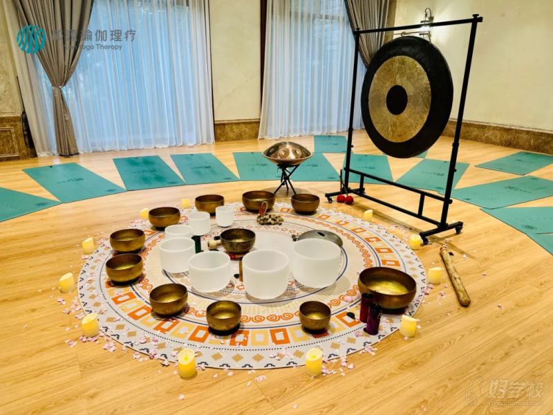 课程地点位于北京邱源瑜伽理疗学院总部,空间设计贴合疗愈需求:日光透过纱帘洒在木质地板,绿垫整齐排列,颂钵、铜锣、水晶钵围成自然共鸣场,烛光点缀其间,滤除外界喧嚣。在这里,每一次钵音、每一次呼吸,都是与身体、自然对话的静谧时刻,助力沉浸式学习。