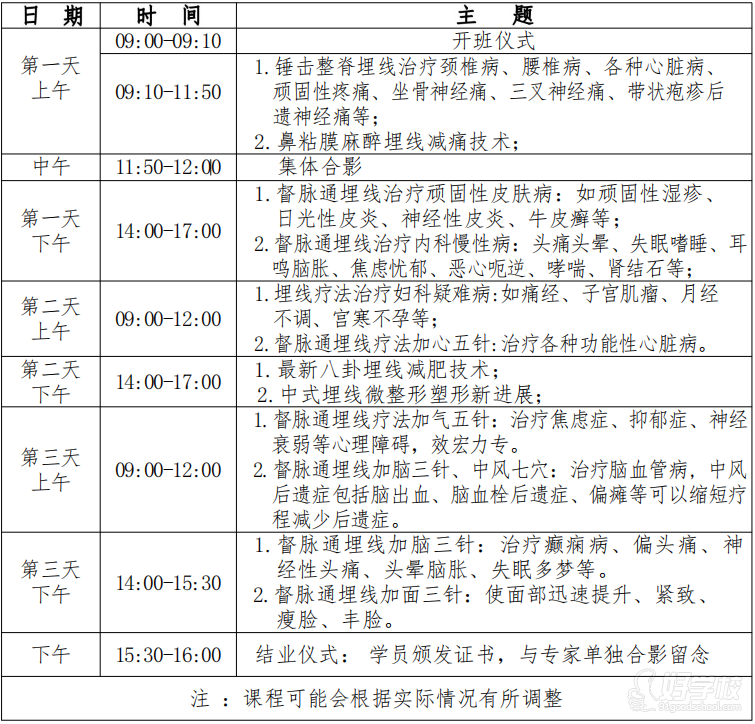 2.创新教学模式,本班每天上午理论知识讲座,下午临床埋线治疗操作教学。理论与临床实践紧密结合,让学员学以致用。由全国最知名埋线专家现场亲自做埋线实际操作,学员协助专家同台操作,观摩学习。结业即可开展工作。