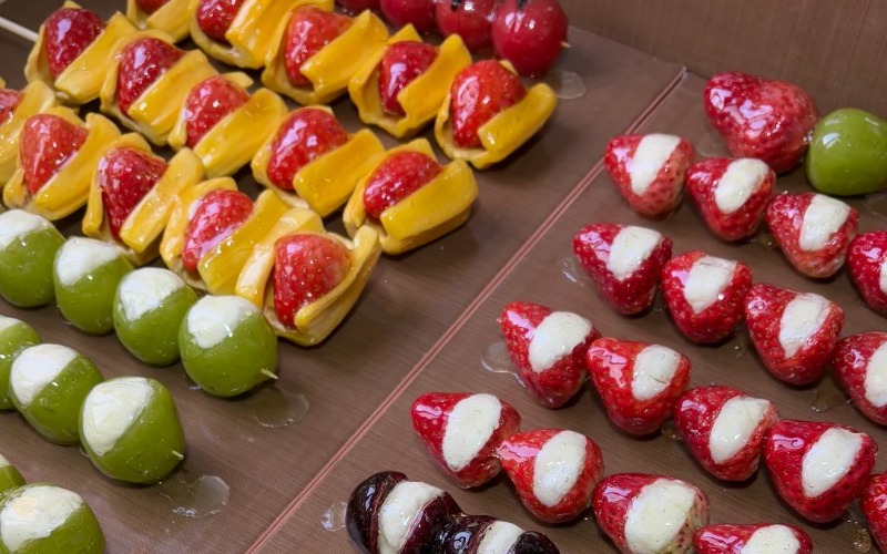 奶皮融合:若制作 “奶皮包裹型” 糖葫芦,需在蘸糖前将奶皮包裹在山楂表面,蘸糖时确保奶皮与山楂紧密贴合(避免糖浆渗入奶皮与山楂之间,导致奶皮脱落),蘸糖后可轻轻按压奶皮边缘(让糖衣将奶皮固定);