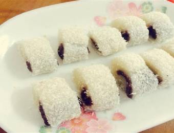 糯米卷是苏式糕点中典型的一种,由糯米、春卷皮、姜、青豆仁、素火腿、香菇等制作而成,口感绵软黏滑,内里有豆沙软馅,让口感愈加湿滑甜润。外层包裹一层椰丝让糯米卷更加香甜美观。