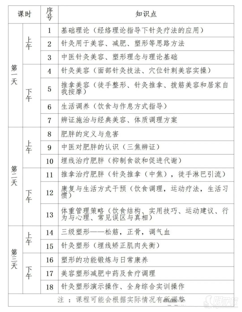 本次课程为期三天,将系统覆盖针灸医学核心理论与临床实操技能,深度解析经络辨证逻辑、穴位配伍规律及针刺操作要领。课程紧扣健康管理与美学需求,贴合现代人“身心平衡”的养生理念,助力学员快速掌握安全自然、疗效持久的美容塑形与健康减重美容解决方案,切实提升临床服务能力。