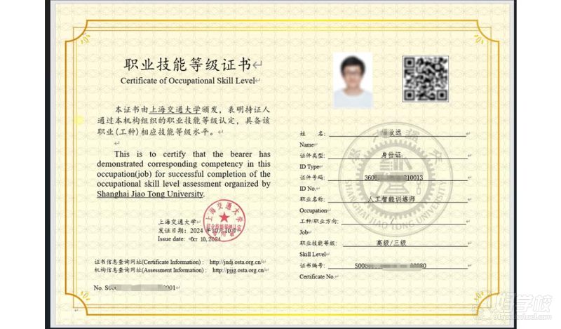 通过考核的学员将获得上海交通大学颁发的人工智能训练师(三级)职业技能等级证书。该证书在上海市范围内具有较高的认可度,能够为学员的职业发展提供有力支持。