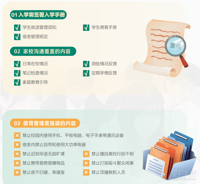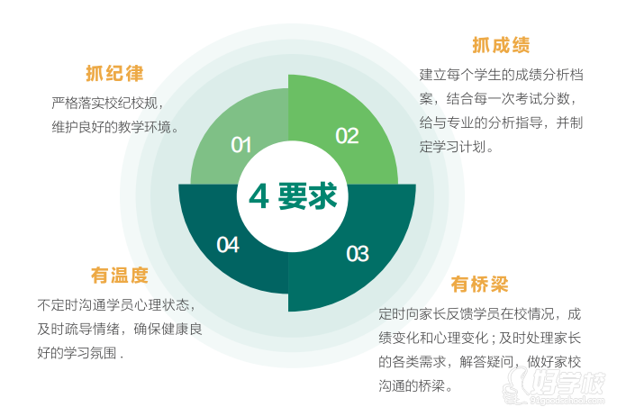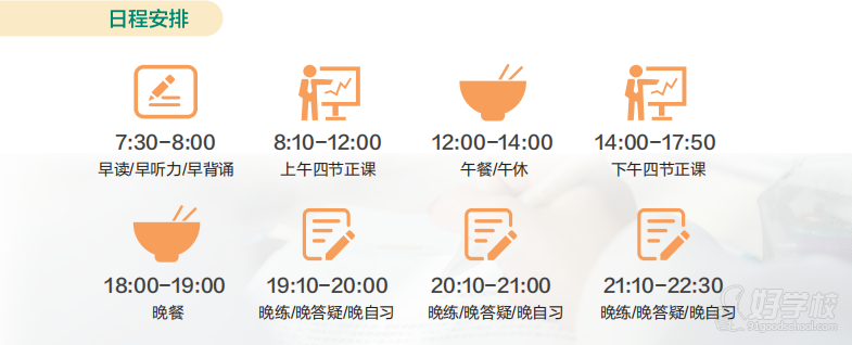 在学员管理方面,新东方全日制学校以日程安排表为基础,采用以班主任为主体,生活管理老师及心理辅导老师三位一体管理模式全方位关注学员学习进步及身心健康,让学员获得成绩进步成就感、学习生活愉悦感、健康成长幸福感