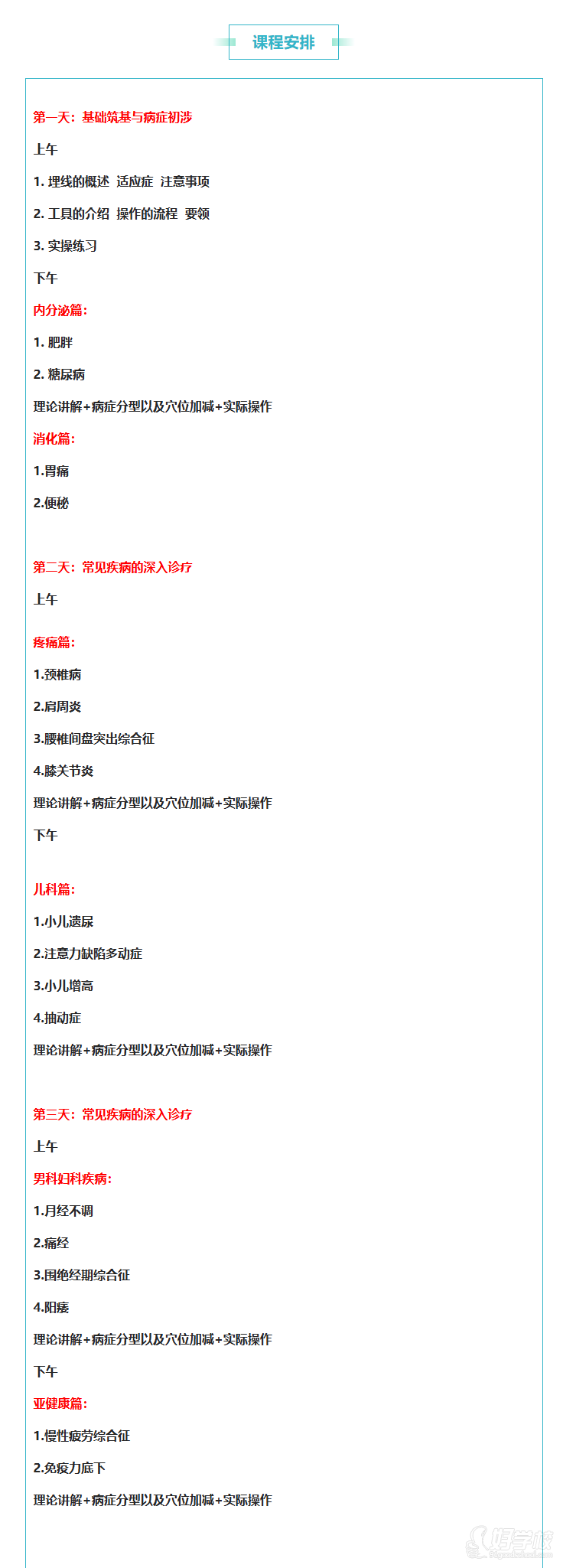 线下 3 天实操面授 + 线上系统视频 + 老师内部群临床指导答疑,每月循环开课。