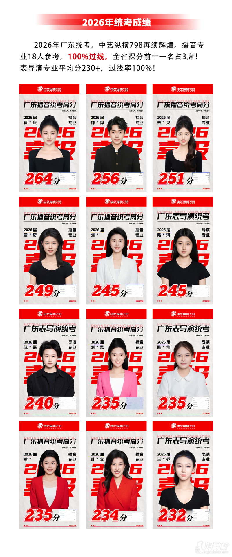 2026年广东统考,中艺纵横798再续辉煌。播音专业18人参考,较高过线,全省裸分前十一名占3席!表导演专业平均分230+,过线率较高!