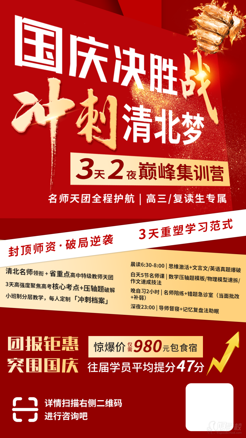 导读:博大教育推出 “国庆决胜战,冲刺清北梦”3 天 2 夜集训营,专为高三和复读生打造。由清北名师领衔,省重点高中特级教师组成的名师天团全程护航,3 天高强度聚焦高考核心考点与压轴题破解,采用小班制分层教学,还会为每人定制 “冲刺档案”。团报仅需 980 元,且包食宿,往届学员平均提分 47 分,助力学子向清北迈进。