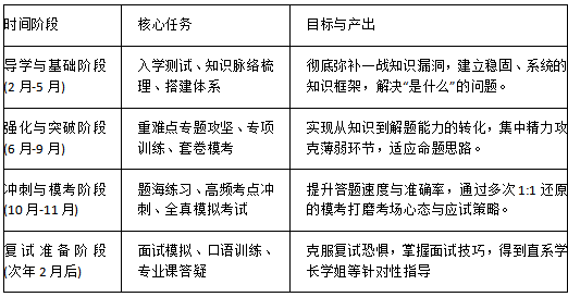 集训营采用“四轮复习法”与阶段性目标管理相结合的模式,将漫长的备考周期分解为可控的模块。以针对2027年考研的全年集训营为例,其科学进阶路径如下表所示: