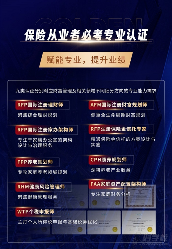 RFP是“国际注册理财师”(Registered Financial Planner)的简称,现已成为全球广泛认可的专业理财认证之一。该认证强调全生命周期财务规划能力,涵盖投资、保险、税务、养老、教育金、风险管理等多个维度,旨在培养具备综合服务能力的高端理财人才。