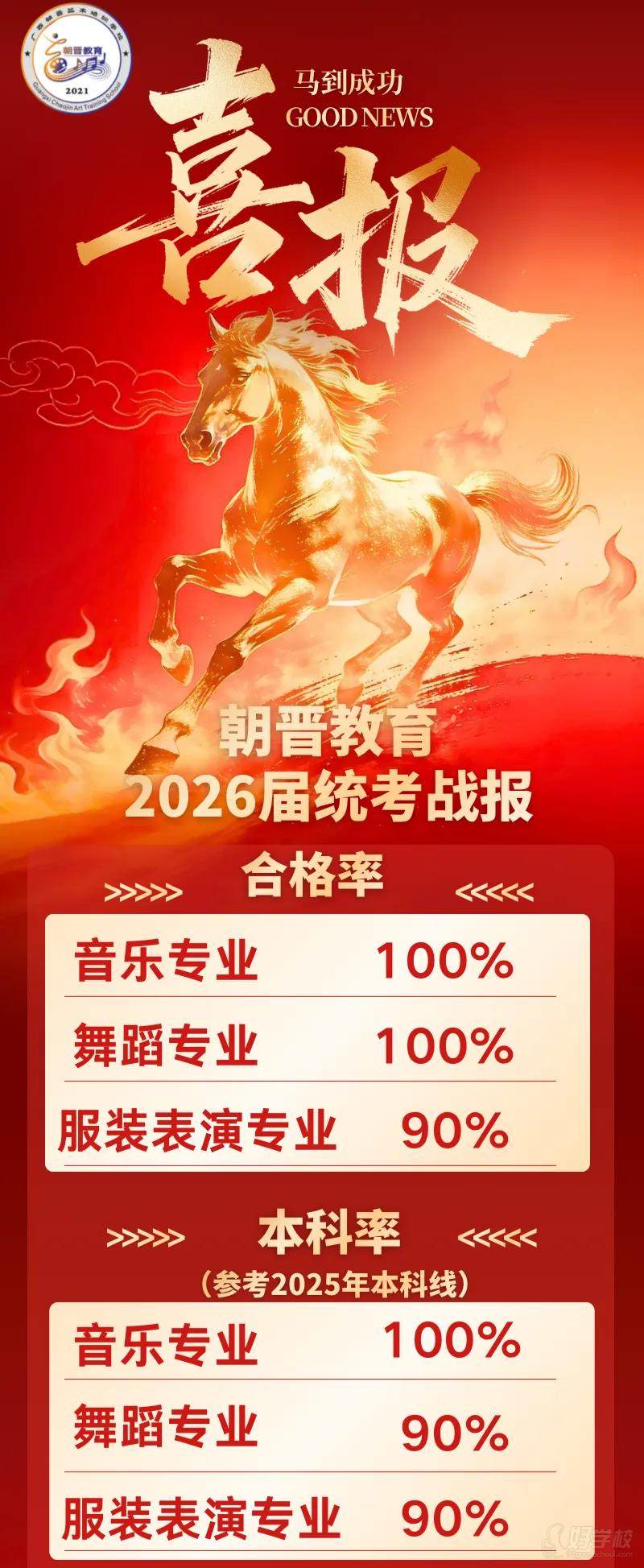 朝晋艺术2026届统考三大专业全线告捷:音乐专业全员合格、本科概率全员上线;舞蹈专业全员合格、本科概率90%;服装表演(航服)专业合格率90%、本科概率90%,全科飘红领跑广西艺考。这份硬核成绩,是专业教学与精准备考的实力见证,为学子筑牢升学根基,是广西艺考生冲刺本科、圆梦理想院校的优选平台。