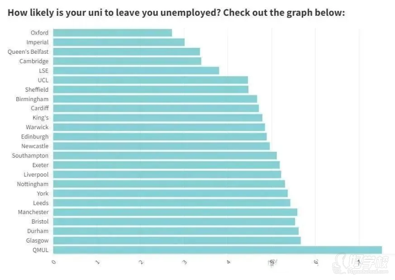 在毕业15个月之后,失业率低的大学是牛津大学,仅2.72%。失业率高的大学是伦敦玛丽女王大学,失业率达到了7.53%。