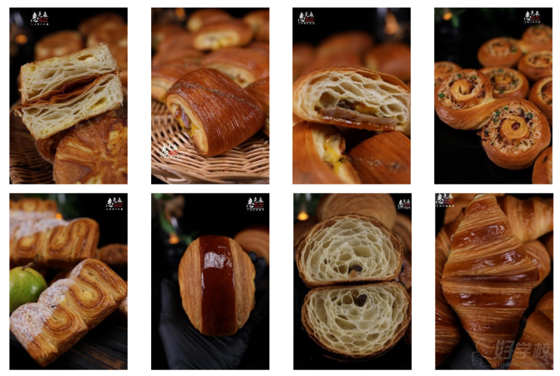 经典款里藏着时光的味道。欧式法棍表皮焦脆,横切面气孔均匀,咬下时的“咔嚓”声里,是对发酵温度、烘烤时长的精准把控;日式红豆包松软绵密,内馅甜而不腻,面团的延展性与馅料的配比,藏着叶林惠先生从家族传承中提炼的“黄金比例”。还有层次分明的千层可颂,酥皮在烘烤中层层起酥,每一口都带着黄油的馥郁,这是学员们反复练习“开酥”工艺后,对传统技法的致敬。