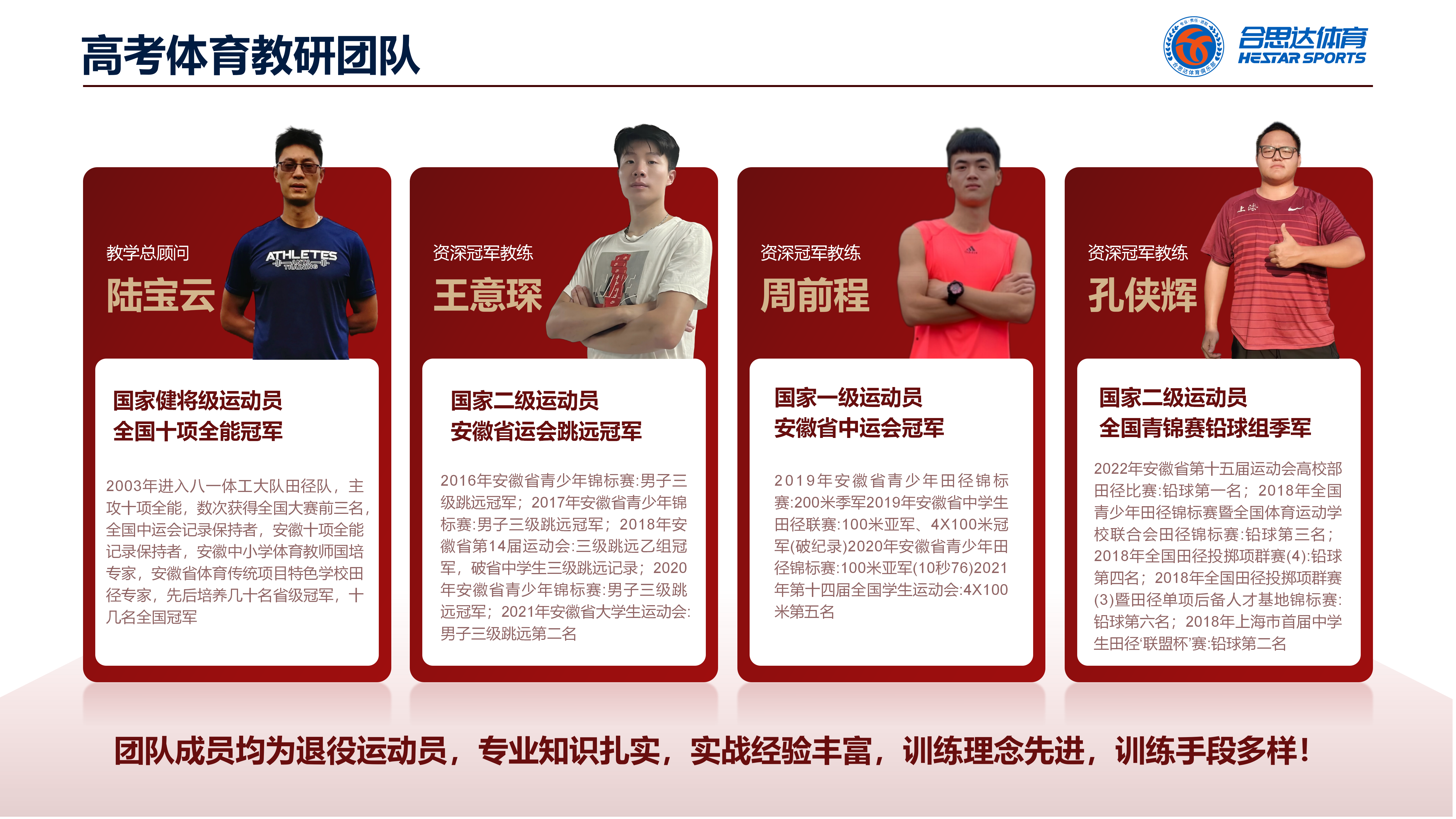针对这一痛点,合思达体育俱乐部组建了一支“硬核”教练团队,核心成员均为运动员出身:教学总顾问陆保云,全国十项全能guanjun;跳远教练王意琛,多次获得安徽省青少年锦标赛男子三级跳远guanjun;铅球教练孔侠辉,2022年安徽省第十五届运动会高校部田径比赛铅球guanjun;跑步教练周前程,2019年安徽省中学生田径联赛100米亚军、4×100米guanjun(破纪录),2021年第十四届全国学生运动会4×100米第五名。他们不仅具备扎实的理论功底,更拥有丰富的实战经验,能够精准捕捉学生的技术盲点。例如在立定三级跳远训练中,教练会利用像机记录学生的动作,逐帧分析摆臂时机、蹬地角度,帮助学生从“会跳”向“跳得远”转变。