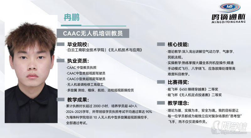 在无人机培训领域,师资力量直接决定着教学质量与学员的学习效果。鸣镝通航深知这一点,组建的教员团队均持有高级执照,平均飞行经验超 5 年,不仅具备扎实的理论功底,更拥有丰富的实战经验。他们熟悉 “理论 + 模拟 + 真机实操” 的三维教学模式,结合机构自主研发的教材,能针对多旋翼、固定翼等不同机型,以及视距内 / 超视距驾驶、航拍、测绘、植保等多个行业应用方向开展教学,无论是零基础想入门的新手,还是有基础想进阶的学员,都能在这里找到适合自己的学习方向,为顺利考取民航局 CAAC 执照、ASFC 证书,进而踏入无人机行业筑牢基础。而在这支优秀的团队中,冉鹏和梁铭豪两位教员,更是凭借突出的专业能力和教学成果,成为学员入行路上的 “得力引路人”。