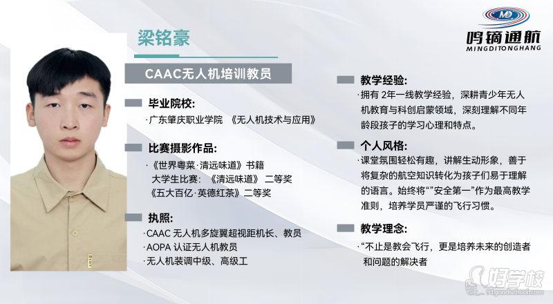 资质上,梁铭豪教员持有 CAAC 无人机多旋翼超视距机长、教员执照,AOPA 认证无人机教员执照,还具备无人机装调中级、高级工资质,专业能力有确保。此外,他在无人机摄影领域也颇有造诣,摄影作品《世界粤菜・清远味道》被收录进书籍,在大学生比赛中,《清远味道》《五大百亿・英德红茶》均荣获二等奖,这份创作能力也为他的教学增色不少,能更好地激发青少年对无人机的兴趣。