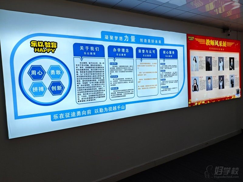 乐以教育的校区入口采用通透玻璃隔断设计,既保持了空间的整洁开阔,也传递出贴合升学场景的学习氛围;教室区域为简约实用的桌椅布局,配备教学大屏,墙面做了静音处理,能有效减少外界干扰,确保学习专注度;校区内的展示墙清晰呈现了机构的办学理念、师资风采等信息,方便学员快速了解机构背景;走廊区域宽敞整洁、采光充足,整体空间规划兼顾了学习的实用性与体验感,能为学员提供舒适的学习配套。
