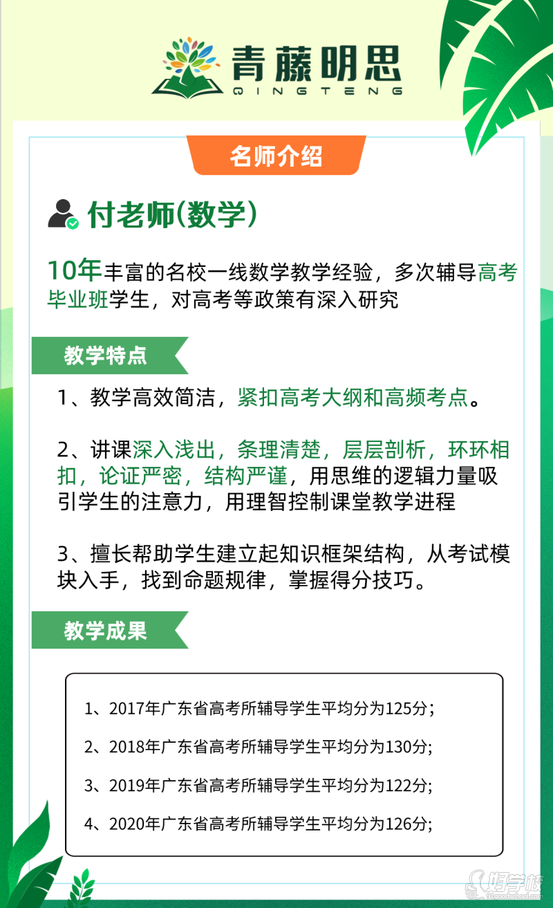 教学成果:2017-2020 年广东省高考中,所辅导学生数学平均分分别达 125 分、130 分、122 分、126 分,成绩稳定优异。