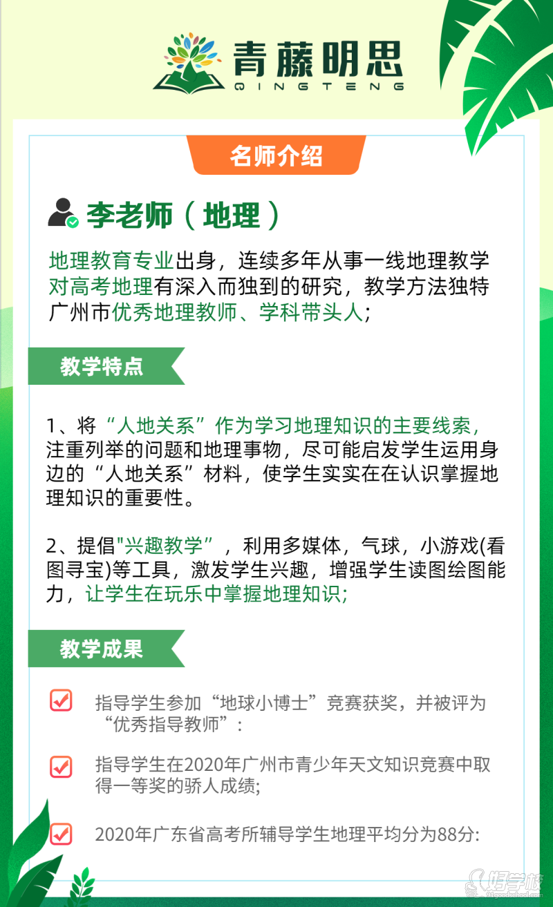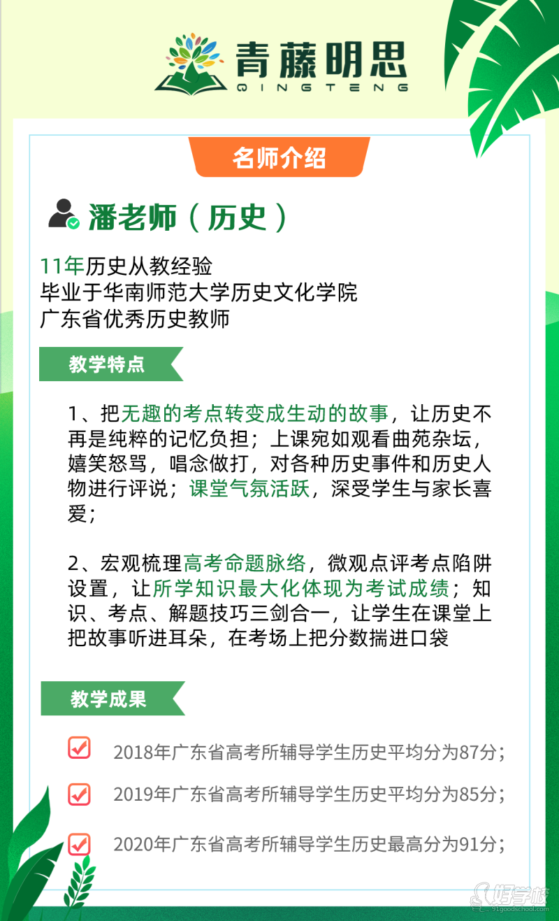 教学成果:2018-2020 年广东省高考中,所辅导学生历史平均分分别为 87 分、85 分,2020 年最高分达 91 分。