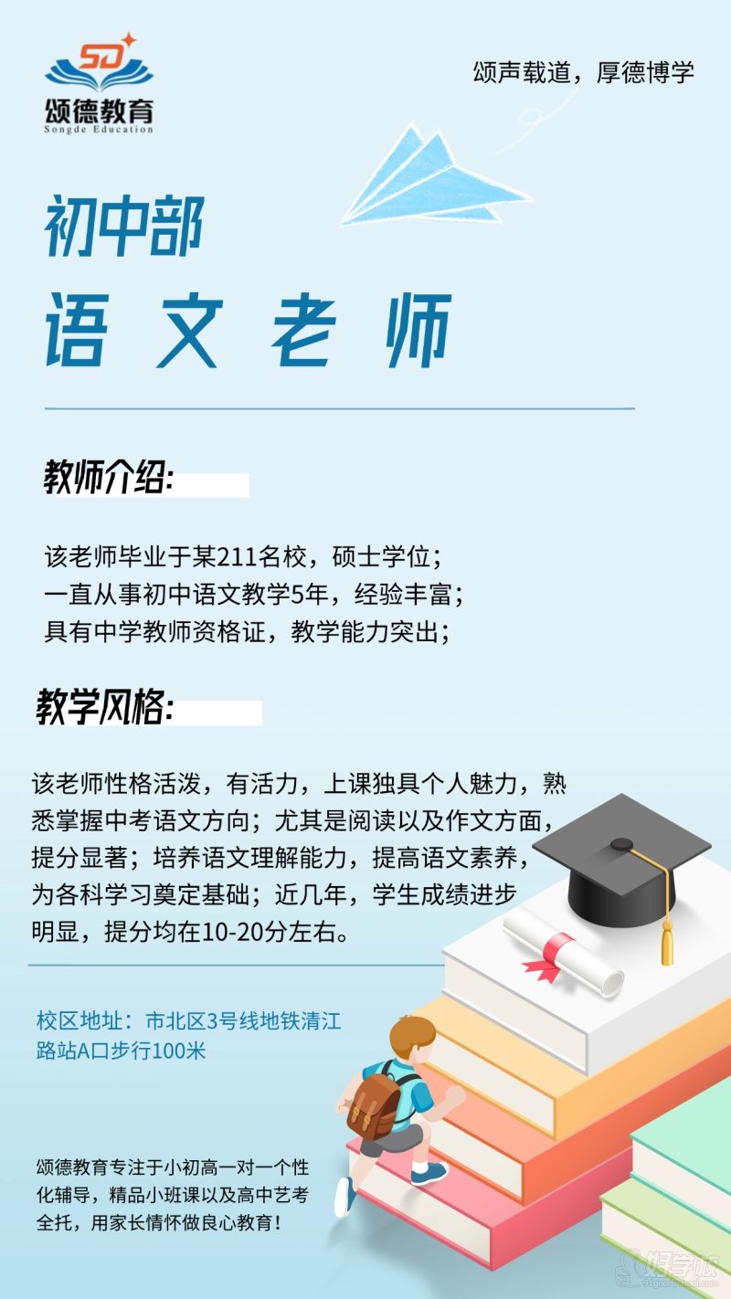 拥有 10 年初中英语教学经验与海外留学经历的教师,教学严谨且细致,能精准发现学生学习漏洞 —— 针对语法薄弱问题,通过 “情境化举例 + 错题复盘” 帮助学生掌握时态、从句等难点;针对中考作文,总结 “模板 + 个性化表达” 结合的提分方法,确保学生在写作中既规范又有亮点。同时,教师注重培养学生英语语感,通过英文阅读、口语互动等方式提升学习兴趣,让原本畏惧英语的学生也能逐步建立信心,实现成绩稳步提升。