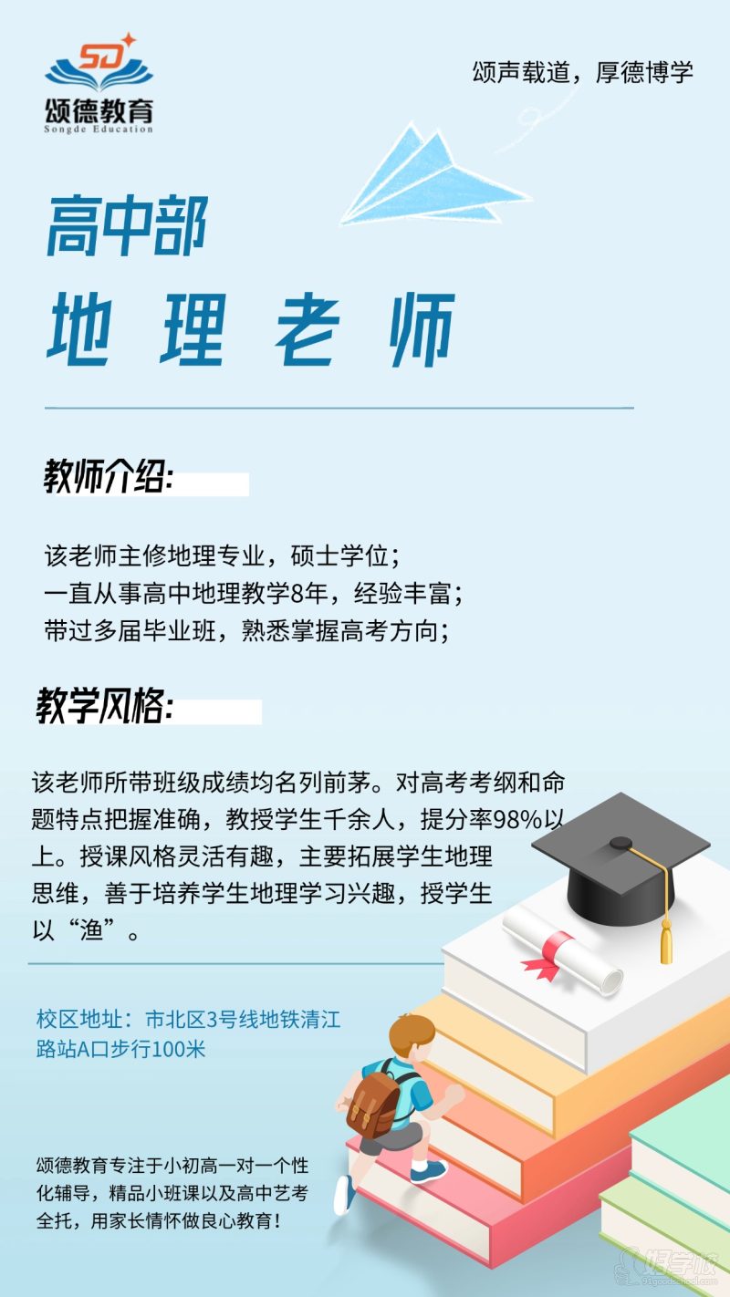 地理专业硕士叠加 8 年高中教学经验,让教师成为高考地理教学的 “专家型” 人才 —— 不仅带过多届毕业班,教授学生超千人,提分率更是高达 98%;对高考考纲、试题特点(如区域地理分析、自然地理计算)的把握精准,能通过 “热点案例教学”(如气象灾害、城市规划)拓展学生地理思维,让抽象的地理知识变得具象易懂。教学中,教师注重 “授人以渔”,不仅传授知识点,更教会学生解题思路与答题规范,尤其适配艺考生短时间内高效提分的需求,帮助学生在地理学科上实现 “从弱到强” 的突破。