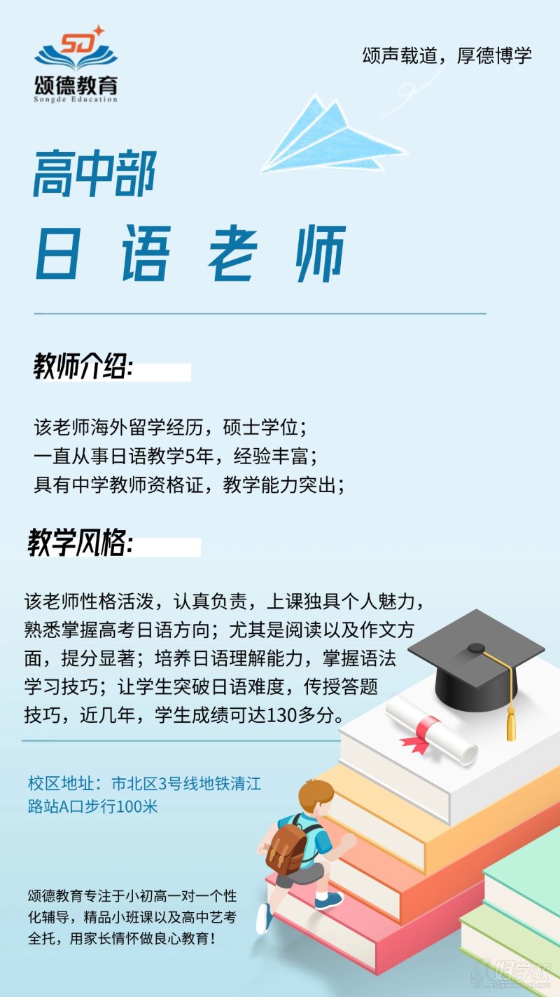 具备海外留学经历与硕士学历的日语教师,拥有 5 年高中日语教学经验,教学风格兼具活泼与严谨 —— 课堂上通过日语文化导入、趣味互动降低学习门槛,帮助学生快速积累词汇与语法;课下针对高考日语阅读、作文两大提分模块,总结 “快速定位答案”“规范书写逻辑” 等技巧。凭借对高考日语方向的精准把握,教师近几年指导的学生,高考日语成绩普遍可达 130 多分,尤其适合英语基础薄弱、希望通过日语 “弯道超车” 的学生。