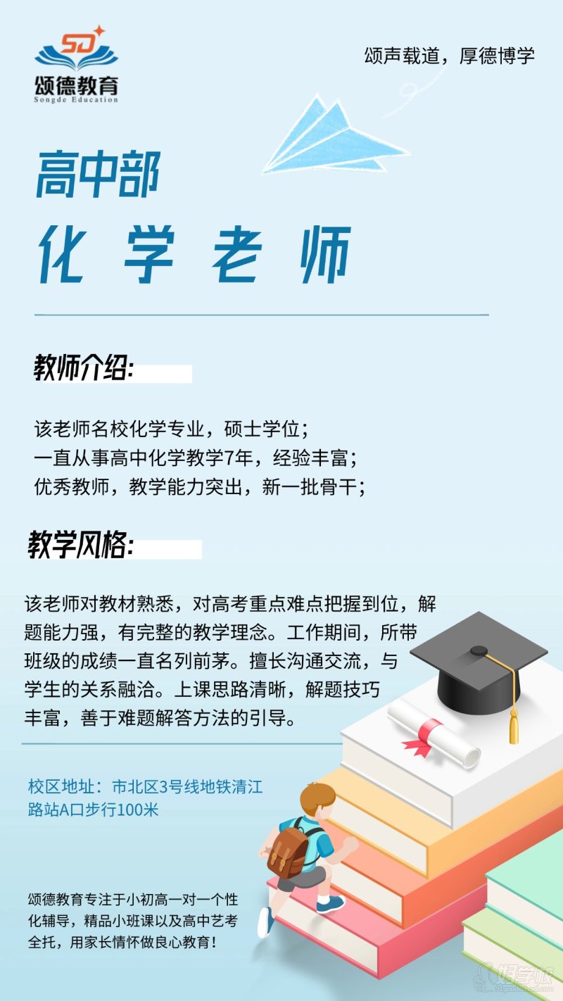 名校化学专业硕士出身的教师,是校级优秀教师与新一批骨干教师,对高中化学教材体系与高考重点难点(如有机化学推断、化学反应原理计算)有精准把控。教学中,教师思路清晰,解题技巧丰富,擅长用 “举一反三” 的方式引导学生突破压轴题;同时注重与学生沟通,通过课后答疑、学习状态跟踪,帮助学生缓解理科学习压力。工作期间,所带班级化学成绩始终在年级名列前茅,无论是基础知识点巩固还是难题拔高,均能满足不同学生需求。
