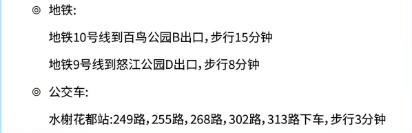 为方便学生到校,学校也标注了交通指引:可乘坐地铁10号线至百鸟公园站B口,或9号线至怒江公园站D口,也可乘公交249、255、268、302、313路至水榭花都站后步行到达。