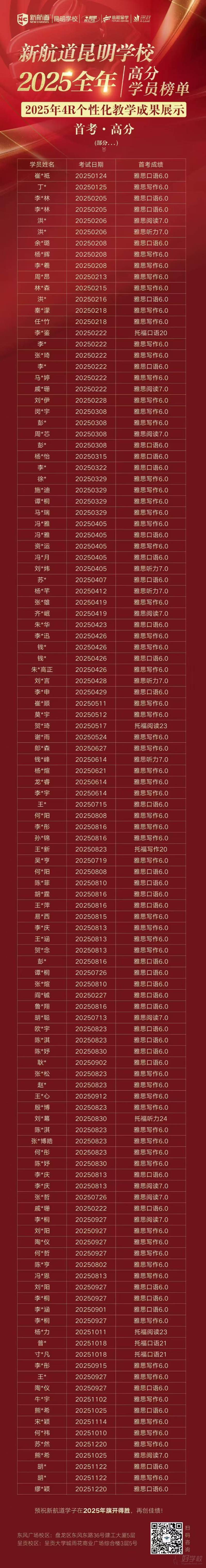导读:雅思高分是留学申请的关键门槛,不少昆明学子在备考中都面临提分慢、技巧不足、目标分数难达成的困扰,迫切想找到能真正出成果的靠谱机构。最近很多计划留学的同学和家长给小编留言,反复打听昆明新航道学校的雅思教学成果到底如何,有没有真实的高分案例和稳定的提分确保。为了帮大家理清选择方向,接下来就带大家深入了解昆明新航道的教学成果,看看它是如何凭借专业教学与贴心服务,助力众多学子实现分数突破的。