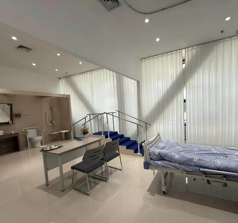 步入校园,开阔整洁的公共休息区尽显舒适 —— 柔和色调的座椅搭配清新绿植,既是学员课间放松的角落,也能作为交流研讨的轻松场所;标准化培训教室配置了整齐桌椅与专业影音设备,宽敞布局适配各类理论课程开展,墙面标语也锚定了聚焦康养产业的办学方向;实操功能区则是核心亮点,护理床、卫浴辅助设施等专业设备齐全,模拟真实护理场景,覆盖医院生活护理、医疗护理等实操训练,让学员在校就能熟悉岗位实际环境。