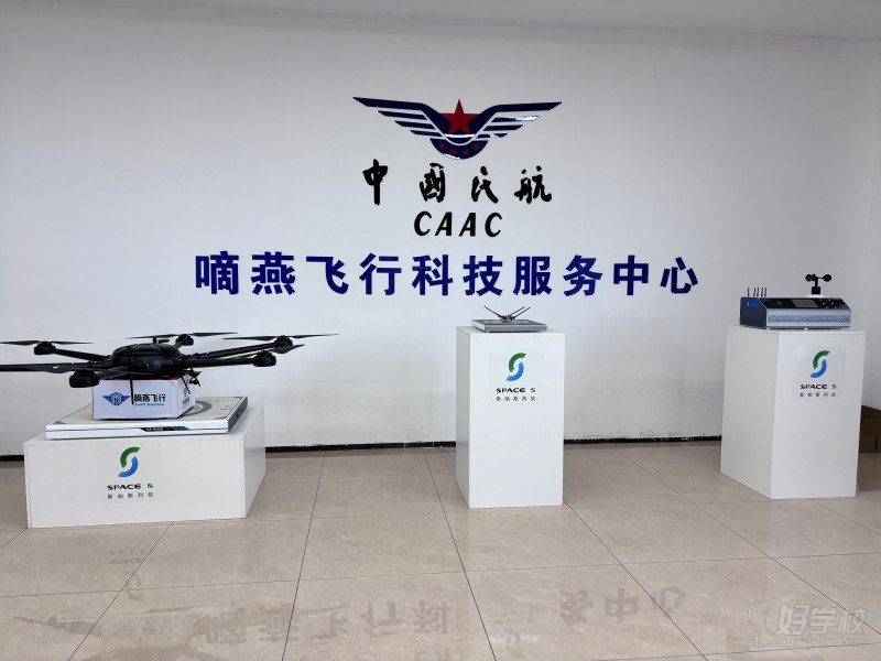 其次是核心展示空间,室内展示区的墙面同时标注 “中国民航 CAAC” 标识与 “嘀燕飞行科技服务中心” 名称,旁侧展台陈列着自主无人机、无人机场等核心设备,从资质背书到硬件产品的展示,直观体现了机构覆盖无人机飞行器、飞控系统等全产业链的业务体系。