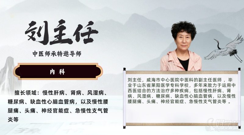 威海市中心医院中医科的副主任医师,毕业于山东省莱阳医学专科学校,多年来致力于运用中西医结合的方法治疗多种疾病,包括慢性肝病、肾病、风湿病、糖尿病、缺血性心脑血管病,以及慢性腰腿痛、头痛、神经官能症、急慢性支气管炎等。